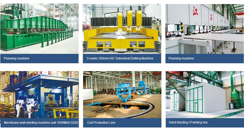 Workshop with 1100 sets of production equipment, has ∮32-∮76 serpentine tube production lines and membrane wall spell row welding machine, driving maximum lifting capacity of 700 tons. Cold roll 180mm / 250mm thickness hot rolled heavy plate bending machine, (8m × 8m × 30m, 800 ℃) overall heat treatment furnace; has a large testing room, equipped with a high temperature of 1000 ℃ electronic testing machine, 6MeV electron linear accelerator, wear through capacity 250mmy ray; owned Lincoln welding machine with a pole, deep butt welded plate automatic welding machine, a small bore pipe welding machine; metalworking shop with CKX511000 type vertical lathe, CNC vertical lathe sizes up φ6.3m * 4m, 4m long gantry CNC deep hole drilling and boring spindle stroke 12m TJK6P20A NC φ200mm floor boring and milling machine and other advanced heavy processing equipment.